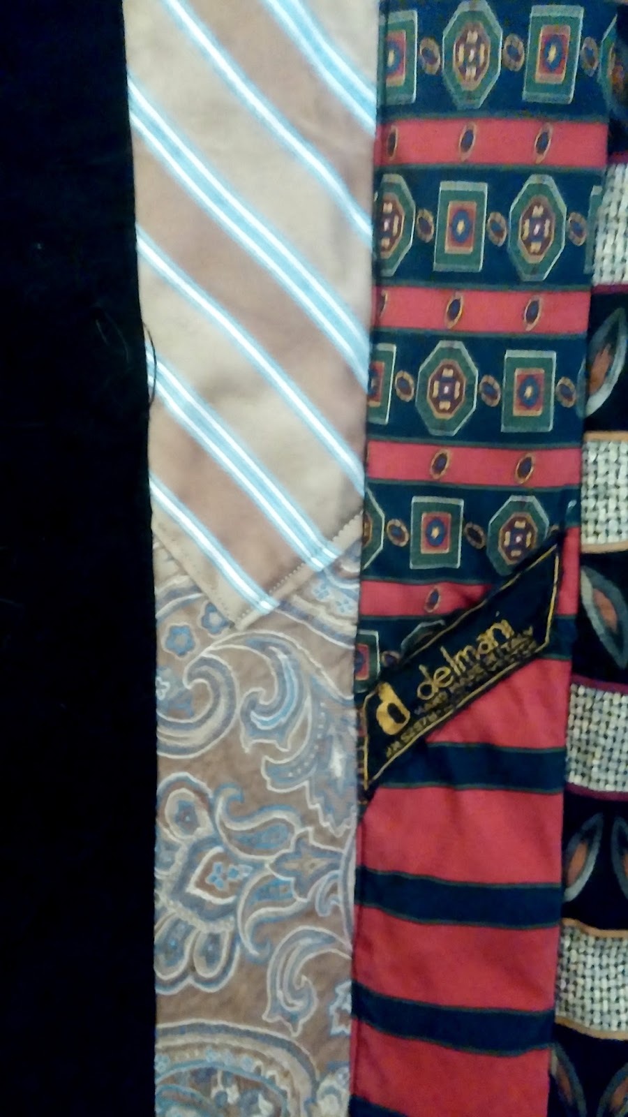 The black background quilt was for the daughter. She loves Asian decoration and this design reminded her mother of a kimono. 37 ties (or pieces thereof) were used in this 3' by 5' quilt. The black background was a meandering freehand and the ties were quilted in the ditch.